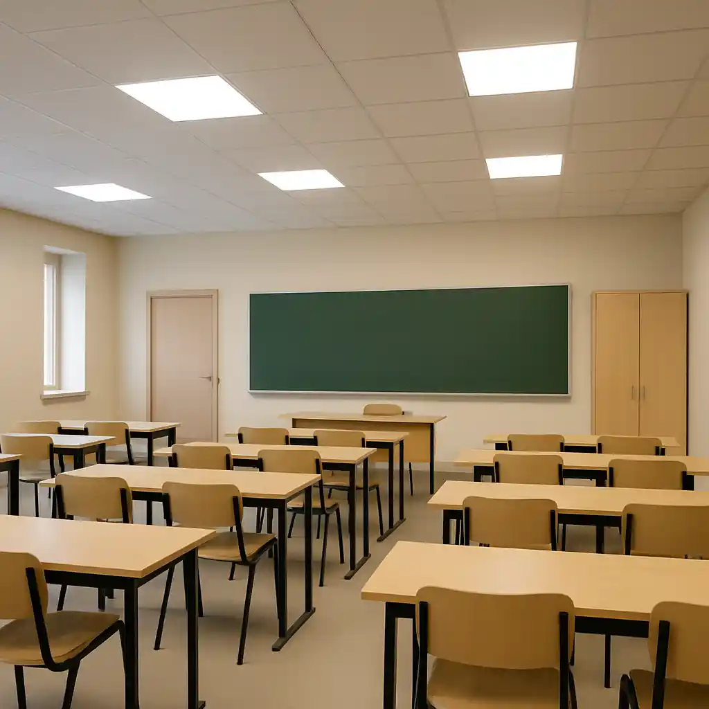 Matinée en classe : lumière blanche froide (5000–6500K) pour stimuler l’attention et faciliter l’apprentissage.